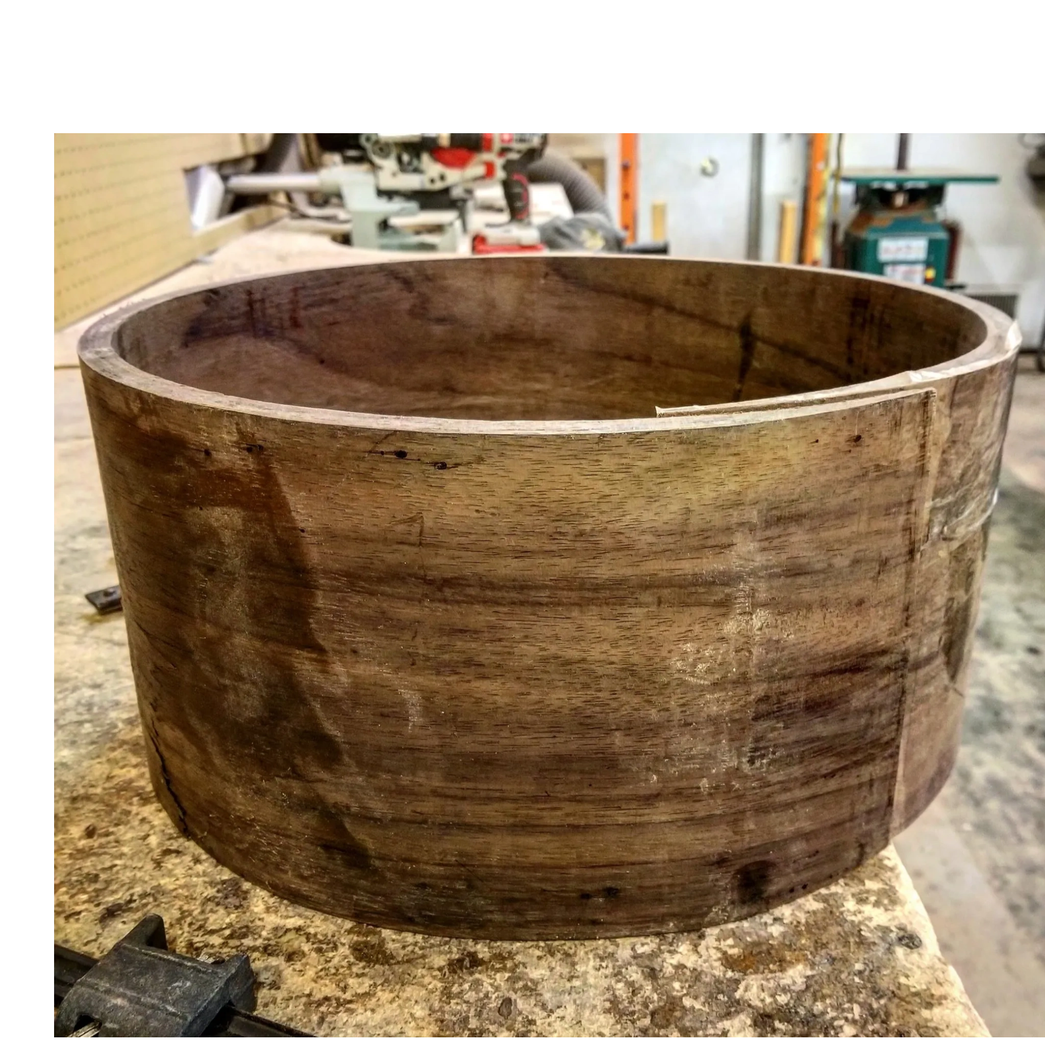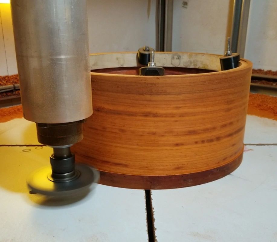 After being hand formed into a perfect circle the drum shell is allowed to cure for many weeks until maximum stability is achieved. When ready, the 1/2" thick piece of solid wood will hold its shape perfectly even without glue.